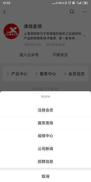第一步,扫描二维码,关注上海茄子影视污成人微信公众号,公众号包括产品中心,服务中心和会员信息三个主菜单。