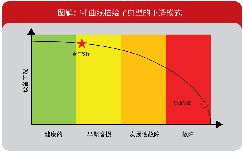 基于工况的维护是利用获取的数据监测现有设备的健康状况。为此,要选择关键参数作为识别发展性故障的指标。设备状况通常会随着时间的推移而下滑。P-f 曲线表明了典型的下滑模式。设备不能执行预期的功能时,就会发生功能故障。基于工况的维护就是要在故障真正发生之前检测潜在的故障。规划维护措施的优势如下: