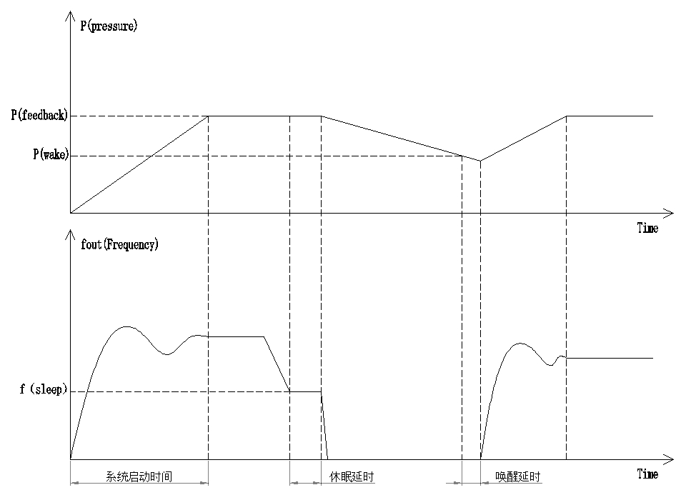 在恒压供水控制系统中,为了节省电能和防止水泵频繁启停,要求当泵的速度低至输出频率下限,延时一段时间后变频器自动停止输出,进入休眠状态;然后当压力反馈值低于设定压力下限值时,再自动唤醒变频器。