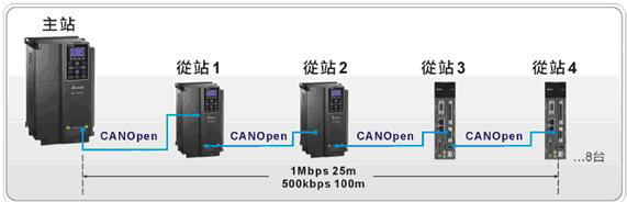 以往的变频器是扮演纯粹驱动的角色,接收上位机的命令做各种机械运动,C2000内建的PLC功能,同时支援CANopen通讯机能,当客户有做两台以上变频器的应用时,只需要透过一台C2000做主站,就可以实现最多同时/控制8台C2000或ASDA-A2伺服的应用,还可以利用分散式I/O的方式来控制远程I/O节点,增加主机 I/O。