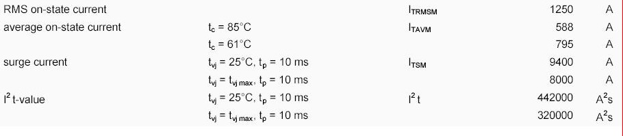 关键数据1:通态电流有效值1250A,与软起动器的额定输出电流能力1290A近似相同;