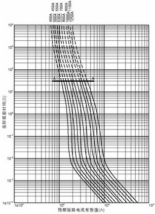 弧前时间具体值可从图五查得。可以查到额定电流800A的快速熔断器,当短路电流为13222A时,弧前时间<2mS;当短路电流为99165A时,弧前时间< 0.1mS。