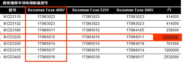 丹佛斯说明书中要求MCD3220前级安装BUSSMANN的170M6012半导体熔断器,要求的可控硅需要的短路保护I