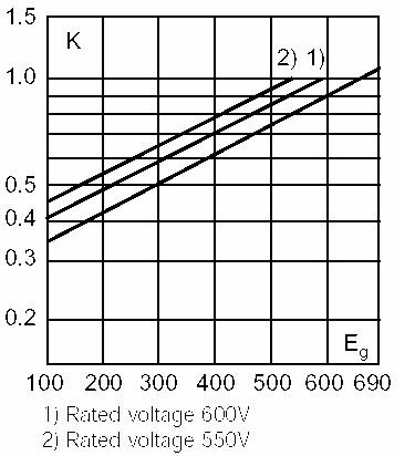 2t值为660V电网电压时的数据,所以还要查表求出400V电网电压时的修正系数,从下图可以查到修正系数约为0.61。