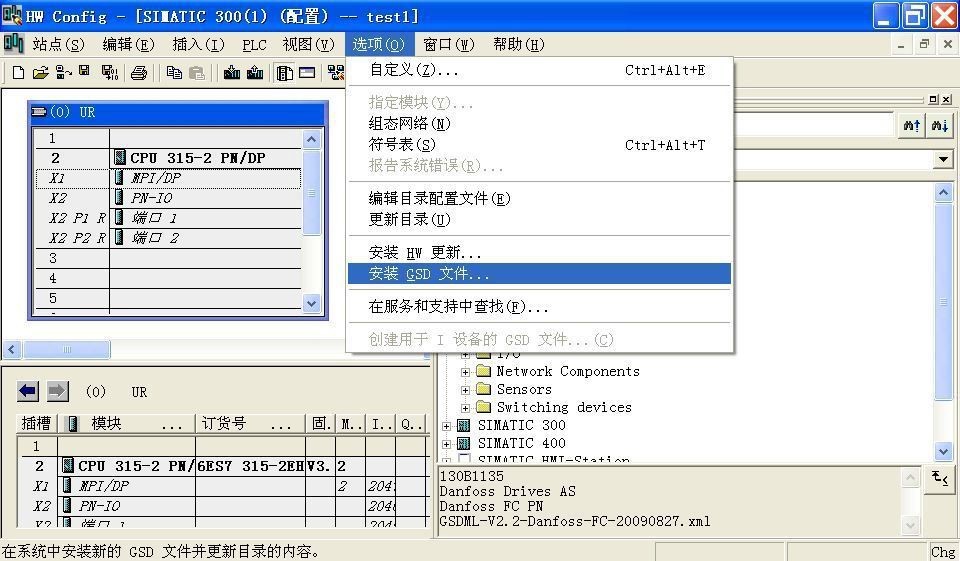 使用 STMATIC STEP7 V5.5 组态软件,进入硬件配置,将 MCA120 的 GSD 文件导入编程 环境中,点击选项—安装 GSD 文件,操作方式如图。
