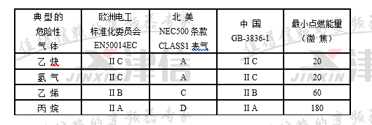 注:中国GB3836标准规定ⅡC级最小点燃能量为19微焦耳,ⅡA级最小点燃能量为200微焦耳。