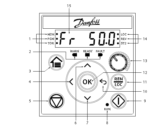 | 1 状态指示灯 | 6 向上 | 11 远程/本地 |