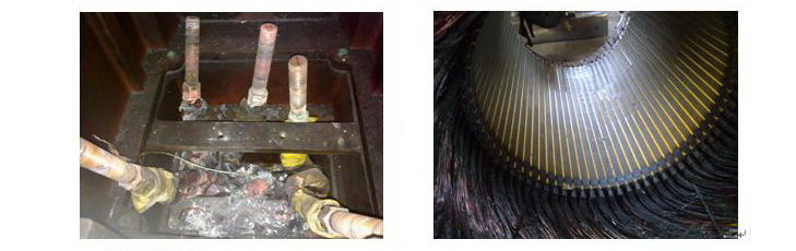电机检查:将电机的接线盒打开后发现,电机的接线柱子已近完全烧坏。后将电机全部拆开发现内部绕组完全烧毁。见下图: