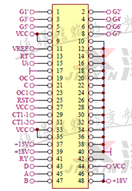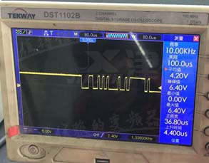 给变频器送电后,变频器面板显示ERR37,根据故障解释说明,检查CPU小板反馈至控制卡的信号波形异常,有带毛刺的尖杂波。测量点为下图45,47号。