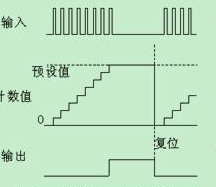 计数器的工作时序图如图二,当产品数量计数到达预设值时,计数器数字量输出信号动作,中止主机运行。等用户将计数器复位以后,主机又可以再次运行。