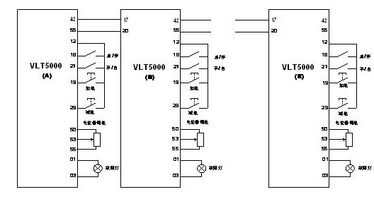 系统由5台VLT5000系列变频器及辅助的开关、指示灯、电位器及必要的空开等电气器件组成。图-1中A变频器的速度作为主速给定(它自身的速度由外部电位器给定), A变频器的42号端子对应自身输出转速,自动的转化为脉冲信号(频率)输出给B变频器,作为B变频器的速度给定信号(通过B变频器的29号端子来接收脉冲信号),然后再由B变频器通过修改内部参数327号,经过计算后相应的输出一定的转速。同理B变频器对应自身输出转速自动的转化为脉冲信号(频率)通过42号端子输出脉冲信号(频率)作为C变频器的速度给定信号(通过C变频器的29号端子来接收脉冲信号),以此类推,一直到E变频器。在此过程中,所有速度给定信号都是数字式的(既速度信号通过给定的脉冲频率的变化,结合自身内部的计算实现不同的转速)。