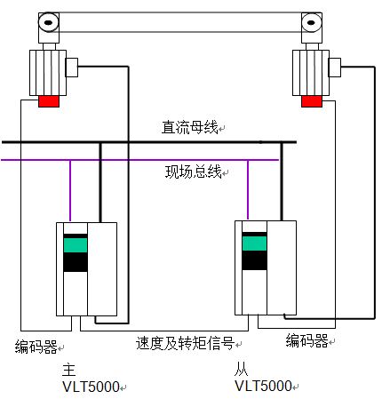 变频器由共用直流母线供电, 丹佛斯可提供整流/回馈装置或由用户提供. 各分部速度可由现场总线提供, 也可由变频器本身形成速度链. 变频器采用速度闭环控制. 从变频器的速度参考值由主变频器给定. 同时主变频器提供给从变频器转矩信号. 从变频器根据其转矩与主变频器的差别, 动态修正从变频器的转速, 从而保证两个变频器出力一致. 所有运算通过可自由编程的工艺控制卡实现.