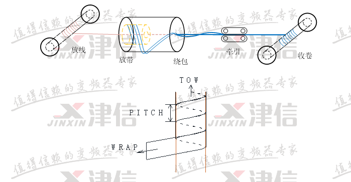 绕包机通过编码器采集当前的生产速度,在触摸屏上面可以调节绕包转速与生产速度的比例,从而改变包带的节距,以及将包带均匀的紧密缠绕在铜线上,以达到工艺要求。在生产速度改变时候,编码器可以实时检测生产速度,保证绕包机的转速同步变化,从而保证节距的均匀性。