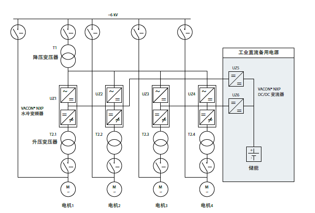 通过采用低压水冷变频器并结合“降压-升压”方案,来驱动中压电机,IC-ART 和丹佛斯共同开发的直流备用电源系统来保证主电晃电或故障时的可靠持续运行。