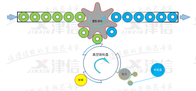 如图中所示;设备采用了真空旋转式标盘,具有吸标、传输、贴标等多方面功能,同时涂胶辊与切刀辊负责标签的切断与涂胶,并设有‘无瓶不出标’和‘无标不涂胶’功能,提高了贴标效率与工作的可靠性。