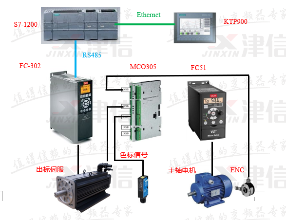 PLC与触摸屏之间进行Ethernet通讯,PLC与丹佛斯FC302变频器之间进行RS485通信,通过触摸屏可以设置标长、对标位置、出标起始位置等工艺参数;FC302变频器控制出标伺服电机,以保证出标精度及响应精度。