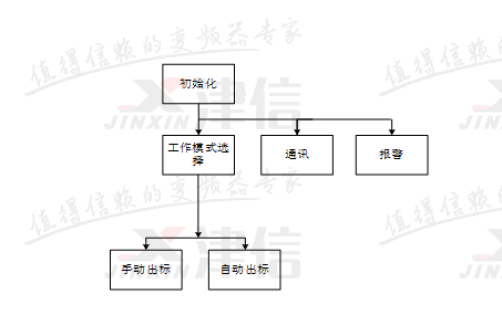 开机后,首先进行程序的初始化。初始化完成后同时调用工作模式选择、报警和PLC与变频器之间的通讯程序。工作模式中,包含手动出标、自动出标两种状态。报警程序用于对机器状态进行实时监控,并根据故障情况执行相关动作。